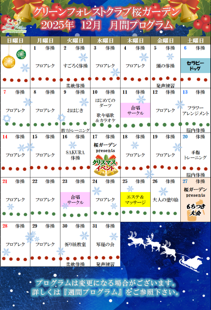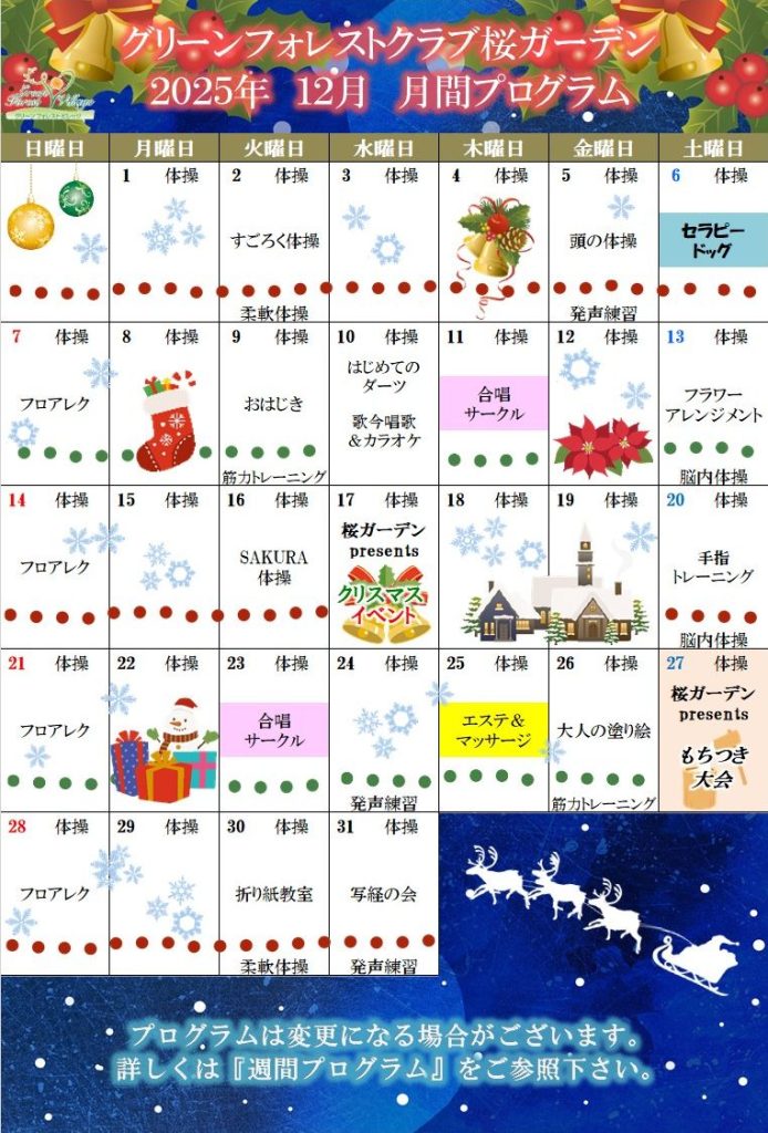 2025年12月 月間プログラム calendar_today 2025/12/1 12月の月間プログラムが完成いたしました。 12月はクリスマスや餅つきなどイベントが続きます。 現在桜ガーデン職員一丸となり企画、準備しておりますので 楽しみにお待ちくださいね!