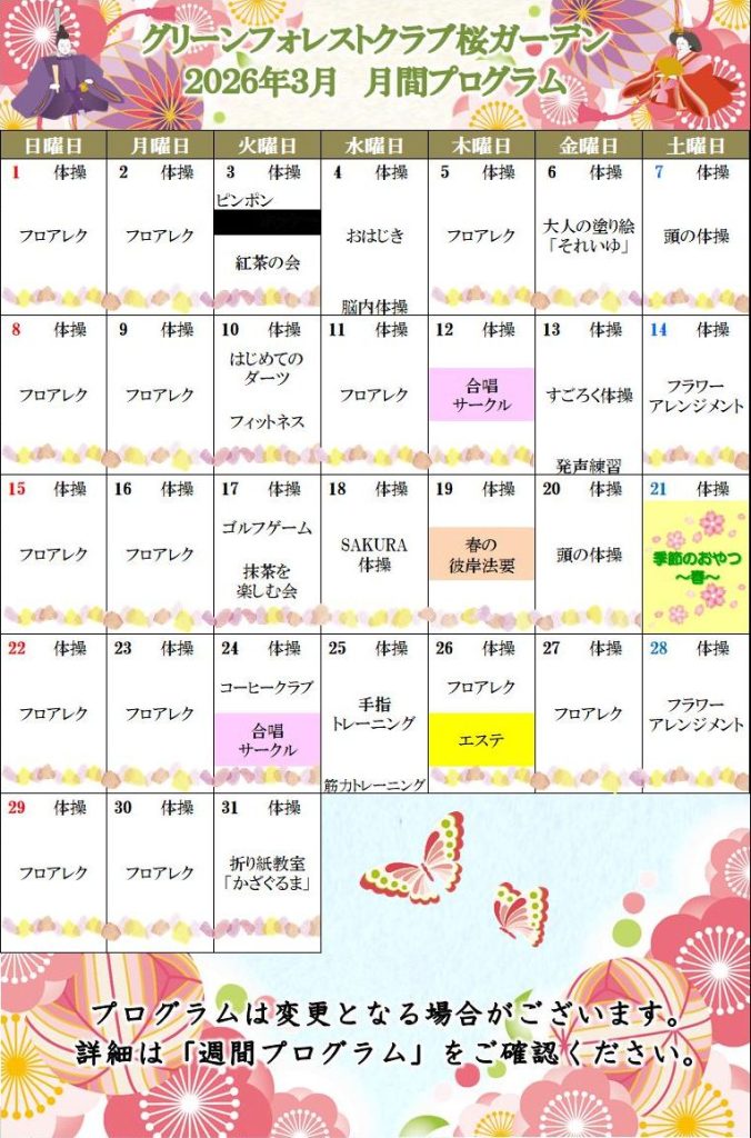 2026年3月 月間プログラム calendar_today 2026/3/1 3月の月間プログラムが完成いたしました! 19日は彼岸法要、21日はおやつイベントです。 彼岸法要ではゆったりと心静かな時間を、 おやつイベントでは季節のお菓子とともに笑顔あふれる時間をお楽しみいただきます^^ 当日をどうぞお楽しみに♪